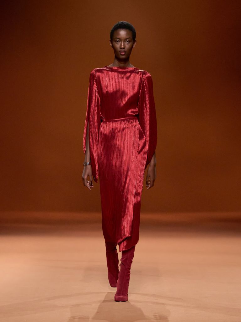 El desfile debut de Sabato de Sarno en Gucci estuvo dominado por prendas minimalistas y cortas, con un rojo oscuro recorriendo todo el desfile anunciando el nacimiento del nuevo color característico de la marca, Ancora Rosso.